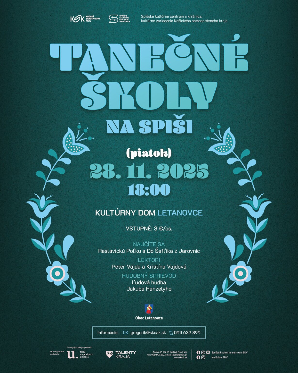 V piatok 28. 11. 2025 sa o 18:00 v Kultúrnom dome v Letanovciach uskutoční škola tanca. Naučíme sa tancovať Raslavickú Poľku a Do Šafľika z Jarovníc. Príďte si s nami zatancovať pod vedením skúsených lektorov Petra Vajdu a Kristíny Vajdovej. O skvelú atmosféru sa postará Ľudová hudba Jakuba Hanzelyho, ktorá vás nenechá sedieť!