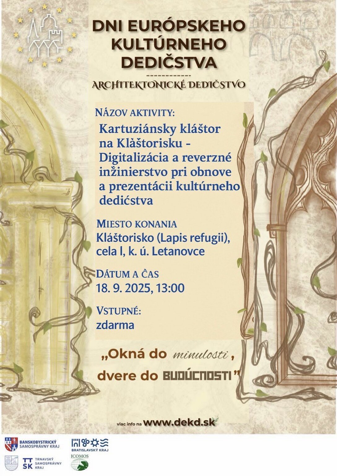 Ide o tradičné podujatie obce Letanovce a príspevkovej organizácie obce KAML, kde i pamiatkári majú svoj podiel spoluúčasti v metodických, odborných i mediálnych spoluprácach. Na podujatí pre verejnosť a návštevníkov oživený legendárny stredoveký kartuziánsky kláštor na Kláštorisku v Slovenskom raji, s jeho najnovšími výskumami s prezentáciami moderných virtuálnych prehliadok a prednášok. Tentokrát tu zažijete v praxi tému Digitalizácia a reverzné inžinierstvo pri obnove a prezentácii kultúrneho dedičstva, v podaní archeológa obce Letanovce Petra Ďuricu, v spoluprácach s Jurajom Slivkom, s obcou Letanovce a s KAML.