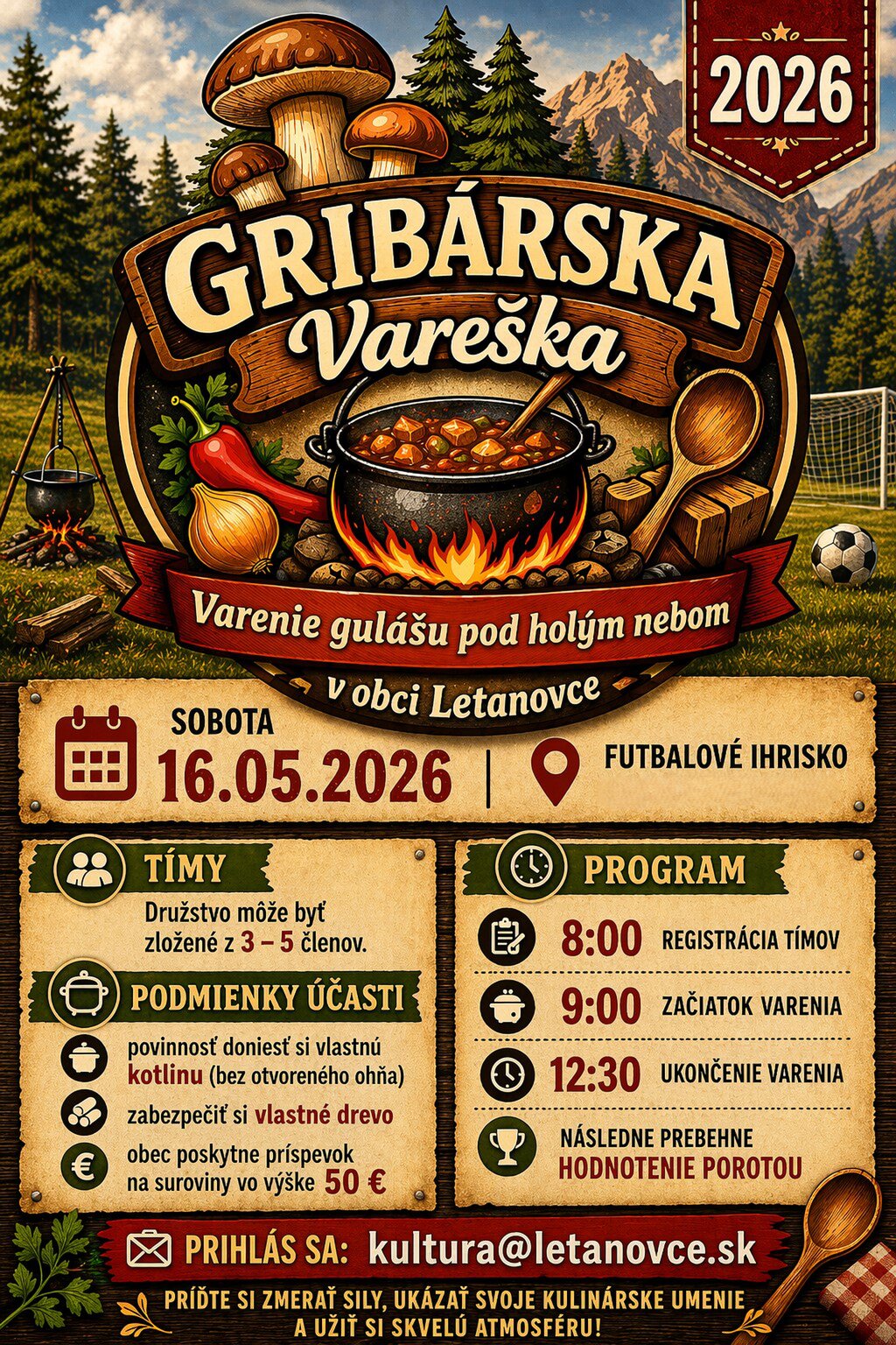 Obec Letanovce srdečne pozýva všetkých milovníkov dobrej nálady a poctivého jedla na podujatie Gribárska vareška, ktoré sa uskutoční v sobotu 16. mája 2026 na futbalovom ihrisku v našej obci.
